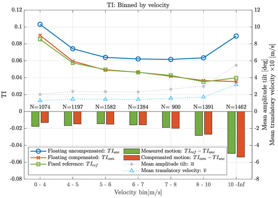 In order to find out if the motion compensation algorithm works similarly well under the influence of varying mean wind conditions, we look at Figure 9. The estimates measured by the land-based reference lidar gradually decrease with increasing wind velocity. At the lowest wind speeds, the turbulence is dominated by thermal effects that do not increase with wind speed proportionally [15]. therefore decreases at increasing wind speeds. However, for the strongest wind speed bin, is slightly higher again, which can be explained by the increased surface roughness of the wavy sea [28]. The increasingly rough sea state at increasing wind speeds is represented in the figure by the gray and blue markers that indicate the measured mean tilt amplitude and mean velocity of the buoy, respectively.