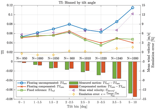 After applying the motion compensation algorithm, we have three different sets of horizontal wind speed time series from the floating lidar. Of all three time series, we estimate according to Equation (4). These are from the internally-processed uncompensated values as they are stored in the 1 files, the values based on the emulated processing described in Section 3.1, and from the motion-compensated time series. As shown in Figure 3, and are not identical. In order to get motion-compensated turbulence estimates from the floating unit that are comparable to the internally-processed values of a fixed reference unit, we define the motion-compensated turbulence intensities as