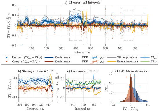 We see clearly that the biggest errors are found where the tilt angle is highest. Subfigure b to the left under the main plot zooms into this strong motion case with a mean tilt amplitude of . measured by the uncompensated floating lidar is much higher than the reference measurements for nearly all intervals. However, around intervals 375, 422, and 437, they drop significantly, and at interval 452, the turbulence measured by the floating lidar without any compensation is even lower than the measurements from the fixed reference. This is even more surprising when considering that the mean tilt amplitude during these intervals is always . We must therefore assume severe measurement issues in one or both of the lidars. This assumption is supported by finding high emulation errors at the same time intervals. This emulation error marked in yellow is, as explained before, an indirect measure of the amount of filtering or cloud detection in the internal data processing of the floating lidar. The values of motion-compensated in the proximity of these four intervals (375, 422, 437, and 452) are on average below the reference line. We remember from Figure 10 that the strong wind case which we look at here is characterized by overcompensated motion. But now it appears that the error does not lie in the motion compensation but might already be contained in the turbulence measurements of one or both of the lidar units. To strengthen this hypothesis, we now look at the test cases with low motion where , shown in detail in the next subfigure.