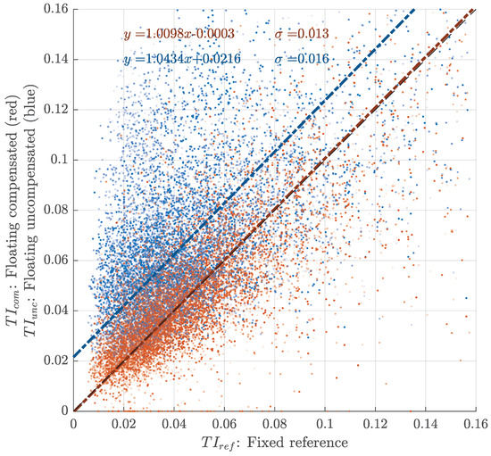 The red markers representing the compensated floating lidar results versus the reference lidar also show high scatter of , which is nearly centered around the line. The determined offset at the origin is only and the slope of leads to an error of motion-induced turbulence of for cases with . Due to the minimization of the quadratic distances, the influence of data points with high scatter is overrepresented in the calculation of the regression lines. But a repeated analysis that excluded all values showed a regression line with a slope of , an offset of , and . These values predicted by the linear regression model are very good.