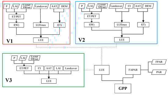 LUE is estimated by Formula (2) in the parameterization approach without CI (approach V1):