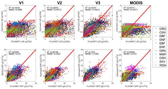 Looking at the validation result in each type of vegetation (Figure 3), it is easy to find that the DBF, GRA and WSA gained high-quality LUE and GPP. In contrast, the two parameterization approaches obtained weak relationships between FLUXNET and estimated LUE in CRO, EBF, MF, CSH and OSH. In CRO, crop species were complicated and might contain C3 plants, C4 plants or both. The different features between C3 and C4 crops [6] introduced errors in CRO. The vegetation in EBF showed few variations in different seasons; therefore, it was difficult to retrieve solid correlations. In addition, EBF was distributed in both high-latitude and low-latitude areas where the maximum LUE and the optimal temperature varied greatly. These factors might lead to the uncertainty in the LUE and GPP in EBF. In MF, OSH and CSH, the main cause was the heterogeneity of plants.