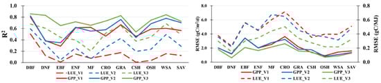 (2) The accuracy of GPP was higher than that of LUE for all types of vegetation.