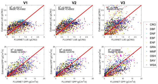 Figure 4. LUE and GPP validation. V1: Parameterization approach without the CI; V2: Parameterization approach with the CI; V3: Cubist regression tree approach.
