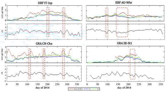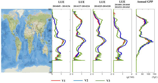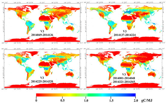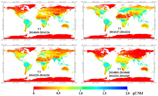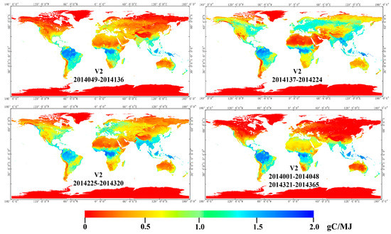 Considering the effect of different radiation modes, we added the CI in the parameterization approach and gained a second global LUE distribution (Figure 6). In general, the LUE distributions produced by this approach were similar to those produced by the parameterization approach without the CI; the differences between the two approaches ranged from −0.1 to 0.4 gC/MJ. For example, the differences included the LUE calculated by the second approach (V2) being even higher in high-value zones, which agrees with a previous study that found that diffuse light enhanced LUE within similar environmental conditions [82]. Looking at LUE in every single season, we found (1) from 2014049 to 2014136, the LUE calculated by V2 in South America, middle Africa, and the Southeast Asia reached 1.8 gC/MJ, which was approximately 0.3 gC/MJ more than the LUE calculated by V1. In Europe, the LUE calculated by V2 slightly exceeded that calculated by V1, by 0.1 gC/MJ. On the other hand, the LUE calculated by V2 was lower than the LUE calculated by V1 in the southwestern USA, the north of Africa, and the southwest of Asia; (2) from 2014137 to 2014224, the LUE calculated by V2 in Europe, Canada and northern Asia reached approximately 1.25 gC/MJ and slightly exceeded the LUE calculated by V1 by 0.15 gC/MJ. However, the LUE calculated by V2 was lower than that calculated by V1 in the southwestern USA, the north and south of Africa, the southwest of Asia and the north of Australia; (3) from 2014225 to 2014320, the differences between the two approaches narrowed. Great increases occurred in the north of South America, middle of Africa, and the southeast of Asia. (4) In the last season, variations continuously decreased in the Northern Hemisphere but gradually increased in the Southern Hemisphere, with more areas showing the LUE calculated by V2 being higher than the LUE calculated by V1. In the four seasons, the equatorial regions all showed an increase in LUE as calculated by V2. The main reason is that these areas had abundant rain for the whole year, which reduced the radiation reaching the surface of the earth, consequently leading to a low CI. Therefore, the addition of the CI increased the value of LUE. Other increases in LUE in the region during the growing season can be explained by there being more rain and lower CI.