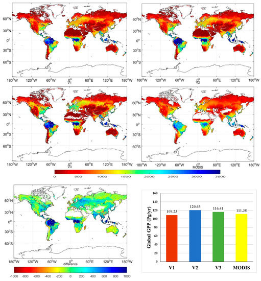 Estimations of global vegetation productivity are essential for improving the understanding of the interaction between the terrestrial biosphere and the atmosphere in the context of global changes and the further formulation of climate policy decisions [1,2]. GPP, a key variable in the global carbon cycle, is influenced by various factors such as temperature [3], soil moisture [4], vegetation types and even tree species [5], crop types [6], tree ages [7] and radiation [8]. To date, many models, including process models and LUE-based models, have been established to estimate global GPP; however, they vary greatly in terms of produced values [9,10,11,12,13,14,15,16,17,18].