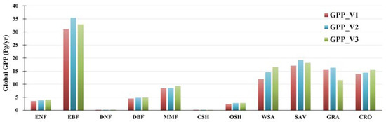 (4) The three approaches produced roughly consistent global annual GPP values, ranging from 109.23 to 120.65 Pg/yr.
