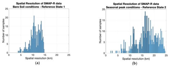 SMAP-R measurements have a non-uniform spatial resolution. The variability on the spatial resolution is linked to the nature of the SMAP-R signals, since the spatial resolution depends on the characteristics of the scattering area. A rougher surface enlarges the scattering area, enlarging the spatial resolution. The presence of vegetation also enlarges the spatial resolution as equally, it results in the scattering coming from a more extensive area. To compute the approximate spatial resolution of each measurement, we applied the methodology also explained in []. According to the results in [], a threshold of 70% was selected, and the delay gathering the 70% of the power was transformed to an ellipse of constant delay on the surface (iso-delay line) []. The size of the scattering area was set to the semi-major axis of the computed ellipse to represent the scattering area of that particular measurement. Figure 1 shows the variability on the scattering area sizes computed for two extreme scenarios: (1) bare soil, characterized by low VWC, low height, and low VOP; and (2) crop seasonal growth peak, characterized by high VWC, high height, and high VOP. The two extreme scenarios were selected as the reference states (RS1 and RS2, respectively) of our dataset and will be further explained in Section 3.