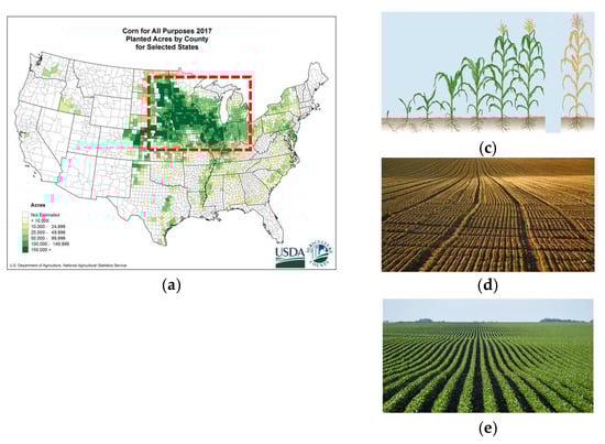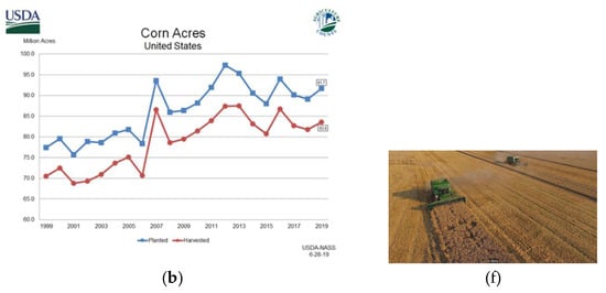 Figure 2a shows the selected site with information from the U.S. Department of Agriculture (USDA) National Agricultural Statistics Service (NASS) database [] showing the amount of planted corn acres per county. The number of acres planted varies year-to-year as can be seen in Figure 2b. SMAP-R data allowed for the temporal series analysis of the U.S. Corn Belt seasonal changes from 2016 to 2019. The maps shown are available at []. Figure 2c shows a sketch of the growth stages of a corn plant. Figure 2d to Figure 2f show images of different stages of the corn, bare soil, plant growing, and harvesting, respectively.