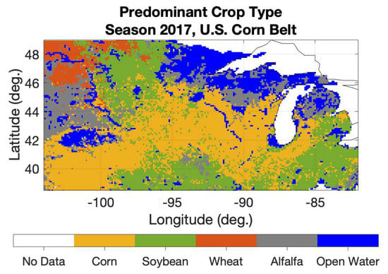 The USDA NASS CropScape–Cropland Data [] provides information on the type and quantity of crops per county in the U.S. and is freely available at []. We used the information in the dataset to assign the predominant crop type to a pixel of 9 km × 9 km, matching SMAP spatial resolution, for the year 2017. The map is shown in Figure 5.