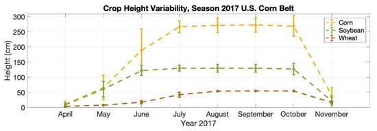 Crop height information for the 2017 season in the U.S. Corn Belt. Note that the monthly mean of the estimated crop height is already filtered using roughness information to the area of low variability, low roughness area shown in Figure 4b.