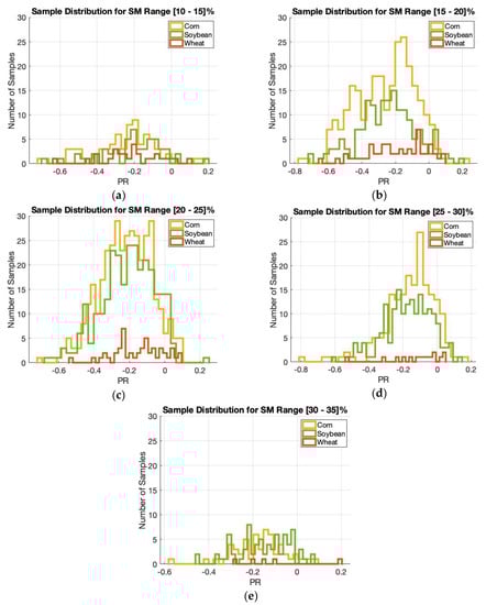 First, the PR sample distribution for five different SM ranges and for each crop type is shown in Figure 13.