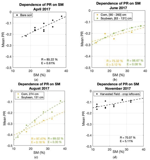 - For bare soil conditions, we observed a linear behavior of the SMAP-R PR observable (Figure 15a,d).