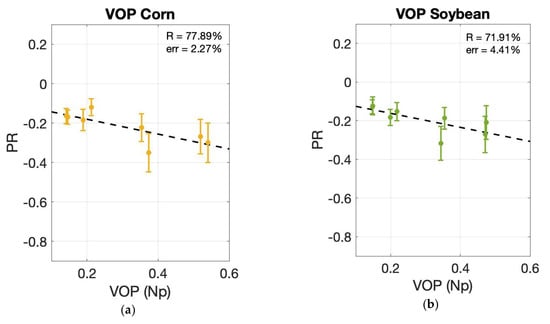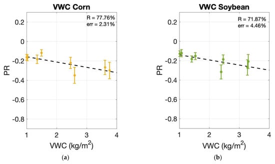 - PR decayed at a mean rate of −0.054 per kg/m2 of VWC. Applying an SM binning of the data, a 9% uncertainty was obtained (Section 4.3), i.e., 0.36 kg/m2.