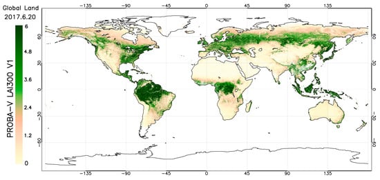 The retrieval algorithm of the CGLS PROBA-V Collection 300 m Version 1 LAI, fAPAR and fCOVER products [8] is based on a two-step process. Daily top of the atmosphere (TOA) reflectances in the blue, red and near infrared (NIR) PROBA-V spectral bands are used in the Simplified Method for the Atmospheric Correction (SMAC) algorithm [19] to retrieve top of canopy (TOC) reflectance values, which are in turn used as inputs to the neural networks (NNTs) to retrieve daily estimates of LAI, fAPAR and fCOVER. The NNTs were calibrated using four years of VEGETATION-2 reflectance data as input. The outputs corresponded to the fusion of the MODIS C5 [20] and CYCLOPES V3.1 [21] for the LAI and fAPAR products and the scaling of the CYCLOPES V3.1 for fCOVER. Then, the final 10-day (dekadal) product values are generated using a dedicated compositing scheme over a dissymmetric temporal window characterized by a flexible size that depends on the availability of valid daily estimates [8]. The compositing includes the application of temporal filters to remove outliers as well as smoothing and gap-filling techniques. A specific process is applied to evergreen broadleaf forests that are highly affected by cloud occurrence, which induces higher noise levels (cloud misdetection) and missing data [8]. The products are delivered in near-real-time (RT0). Then, two successive consolidated estimates after one (RT1) and two (RT2) dekads are generated. A final estimate (RT5) is computed at the end of the consolidation period (i.e., 50 days). The final RT5 product is used in this study. An example of the PROBA-V LAI 300 m V1 spatial distribution is shown in Figure 1. The products are associated with quantitative quality information such as the number of valid daily values available in the compositing window, the root mean square errors of the dekadal values compared to the daily estimates and the length in days of the semiperiod of the compositing window before and after the dekad of interest. In addition, qualitative information is provided through a quality flag. The retrieval algorithm and the products are described in detail in the Algorithm Theoretical Basis Document [8] and the Product User Manual [22]. The first validation results that include all RT modes are reported in the Quality Assessment Report [23].