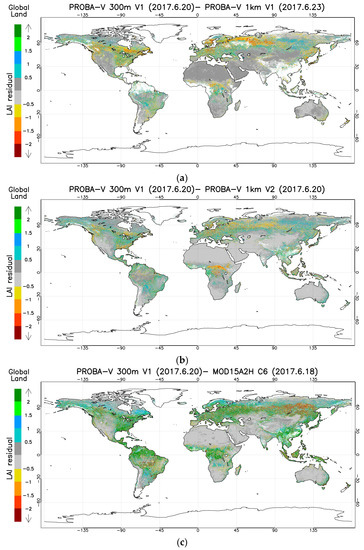 Figure 2. LAI residual map between PROBA-V Collection 300 m V1 and Collection 1 km V1 (a), Collection 1 km V2 (b), and MODIS C6 (c) for 20th June 2017.