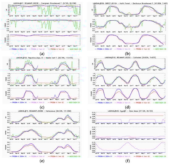 Figure 3. Example of temporal profiles (Jan 16–Dec 17) of PROBA-V Collection 300 m V1 and reference products (PROBA-V Collection 1 km V1, PROBA-V Collection 1 km V2 and MODIS15A2 C6) for sites corresponding to evergreen broadleaved forest (a), deciduous broadleaved forest (b), needle-leaf forest (c), cultivated (d), herbaceous (e) and bare areas (f).