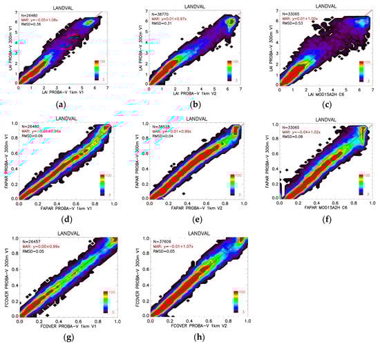 Figure 4. Scatterplots between different pairs of LAI (ac), fAPAR (df) and fCOVER (g,h) PROBA-V Collection 300 m V1 and reference satellite products (PROBA-V Collection 1 km V1 (a,d,g), PROBA-V Collection 1 km V2 (b,e,h) and MODIS C6 (c,f) computed over all LANDVAL sites for the 2016-2017 period. Statistics of the comparisons are reported in Table 5, Table 6 and Table 7.