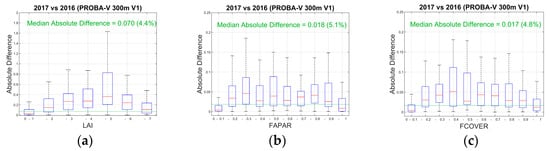 Figure 5 shows the boxplots of the inter-annual absolute difference between two consecutive years for Collection 300 m V1 products. For LAI, larger absolute differences are found in the range of 4–5 LAI units, with differences of approximately 0.4 and typically below 0.3 for the other ranges. The median value for all the samples is 0.070 (4.4%), which is lower than that of Collection 1 km V1 and MODIS C6 (Table 8). The Collection 1 km V2 LAI product shows the lowest median absolute difference (approximately 3%). The fAPAR Collection 300 m V1 product shows median absolute differences lower than 0.05 for all levels of fAPAR values, and the median absolute difference of 0.018 (5.1%) is slightly higher than that for the Collection 1 km product but lower than that for the MODIS C6 product. The Collection 300 m V1 fCOVER products show similar precision as the LAI and fAPAR, and the results are similar to that of Collection 1 km V1 fCOVER.