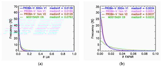 Figure 6 shows the histograms of the δ values (Equation (1)) for LAI and fAPAR products under study. The PROBA-V Collection 300 m V1 products show very similar histograms to the Collection 1 km V2 products since both are smoothed products, which also explains the lower median δ values obtained. The MODIS C6 histograms show higher frequencies for large delta values indicating noisier temporal evolution and lower intra-annual precision. For Collection 300 m V1, the median value used as an indicator of precision over short time scales shows values of 0.014 for LAI and 0.003 for fAPAR and fCOVER (not shown here for the sake of brevity), indicating high precision, and the result is slightly better than that of the Collection 1 km V1 products (0.017 for LAI and 0.005 for fAPAR and fCOVER). The MODIS C6 products show median δ values higher than Collection 300 m V1, indicating lower intra-annual precision as observed in the temporal profiles (Figure 3).