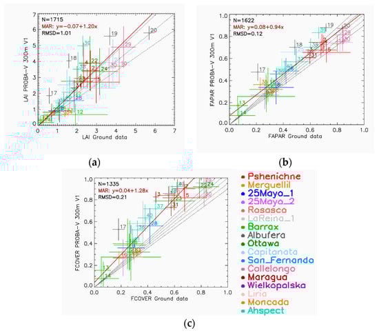 Ground-based maps were provided with a quality flag indicating the pixels that belong to the convex hull computed from the set of pixels used to calibrate the up-scaling transfer function [15]. For the accuracy assessment we considered only the Collection 300 m V1 PROBA-V pixels for which more than 70% (threshold more restrictive than in previous studies [11,12]) of the corresponding high-resolution pixels were within the convex hull. The accuracy with respect to ground measurements was then assessed using the metrics defined in Table 3. Overall uncertainty (i.e., root mean square deviation, RMSD) includes systematic measurement error (i.e., bias) and random measurement error (i.e., standard deviation of bias). RMSD is recommended to report the accuracy of LAI products when there is only one product estimate to each ground mapping unit [9]. Major Axis Regression (MAR) was used because it is specifically formulated to handle errors in both the x and y products [62]. In addition, the accuracy assessment with ground data was conducted at 3 km × 3 km using the same number of samples; if there was a missing value in one dataset, then this observation was removed from the other datasets in order to have a consistent database for intercomparisons of results.
