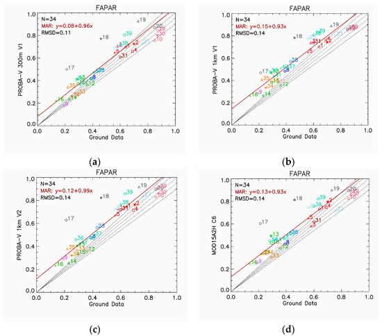 Finally, the overall spatiotemporal consistency between the Collection 300 m V1 and reference products was assessed over the LANDVAL network of sites considering the best-quality observations (Table 1) for the two-year period. Scatterplots between pairs of products were produced, and the associated validation metrics (Table 3) were quantified (Section 4.1.3).