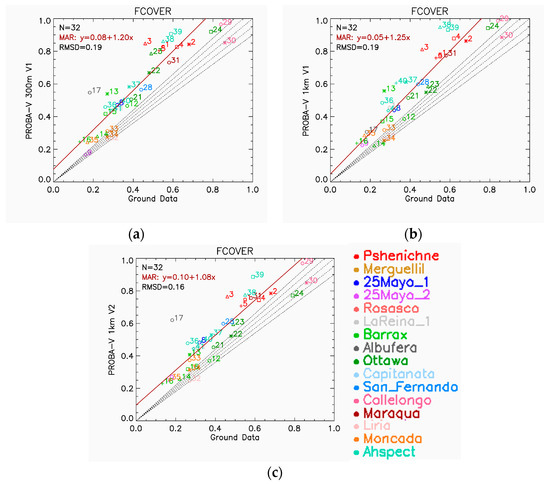 Finally, for the fCOVER results, the scatterplots show good linear consistency (Figure 4), with correlations of 0.99 and overall discrepancies (RMSD) of 0.05 between PROBA-V Collection 300 m V1 and both PROBA-V Collection 1 km V1 and V2 products (Table 7). Almost no mean bias is found in the comparison with Collection 1 km V1, although Collection 300 m V1 tends to provide higher values than Collection 1 km V2 (bias = 0.012, slope = 1.07). The analysis per biome reveals that bias mainly occurs for the cultivated and herbaceous sites with medium and high vegetation values (Figure S8).