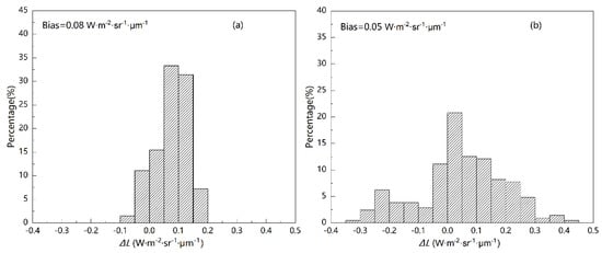 After the stray light correction, some changes in band TOA radiance should be observed. On the basis of the above clear-sky Landsat 8 images over the ground sites, we investigated the band TOA radiance changes caused by the stray light correction. From the 207 images over the five sites, Figure 1a shows the TOA radiance difference (ΔL) of Band 10 before and after the stray light correction, and Figure 1b is the case of Band 11. The bias of both bands turned out to be slightly positive, which meant that the TIRS data became minimally “hotter” after the stray light correction in general. For Band 10, the histogram of ΔL was mostly concentrated larger than zero, with a bias of 0.08 W·m−2·sr−1·μm−1. A general positive TOA radiance change was observed for this band, although such a change was unremarkable. For Band 11, ΔL showed a broader distribution but had a similar bias with Band 10, indicating that the stray light on Band 11 was corrected in a larger scale and the variance of correction was also greater than that of Band 10.