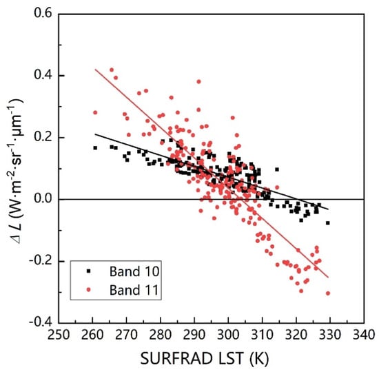 The effect of stray light is related to LST [17], hence, the relationship between correction results and LST is necessary to explore. As stated in Section 3, the LST calculated from the SURFRAD data was regarded as the reference LST for the evaluation. Figure 2 shows the scatter plot between ΔL caused by the stray light correction and SURFRAD ground LST (SURFRAD LST). A negative correlation was firstly observed, and the radiance of Band 11 was found to have a more significant negative relationship between ΔL and SURFRAD LST than that of Band 10. In the low LST range of 260–280 K, the stray light correction of Band 11 was 0.2–0.4 W·m−2·sr−1·μm−1, which was larger than that of Band 10. In the LST range of 290–300 K, the stray light correction of the two bands became nearly the same, with a value of approximately 0.1 W·m−2·sr−1·μm−1, corresponding to a temperature difference of approximately 0.7–0.8 K. For LST > 310 K, the absolute value of the stray light correction of Band 10 was smaller than that of Band 11. Such modification can result in a remarkable effect on the final LST retrieval, especially for the single-channel method. This study analyzed this effect, as stated in the following Section 4.2, to clarify the change on LST retrieval result before and after the stray light correction.