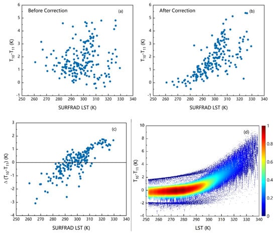 Relationship of brightness temperature difference (T10 − T11) and ground-measured LST (denoted as SURFRAD LST). (a) Before the stray light correction and (b) after the stray light correction. (c) Change (Δ(T10 − T11)) in the brightness temperature difference before and after the stray light correction. (d) Density scatter plot of (T10 − T11) and LST in the simulation dataset.