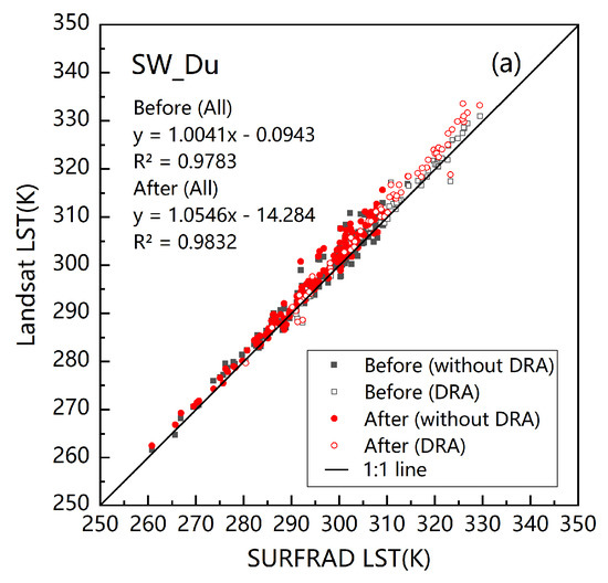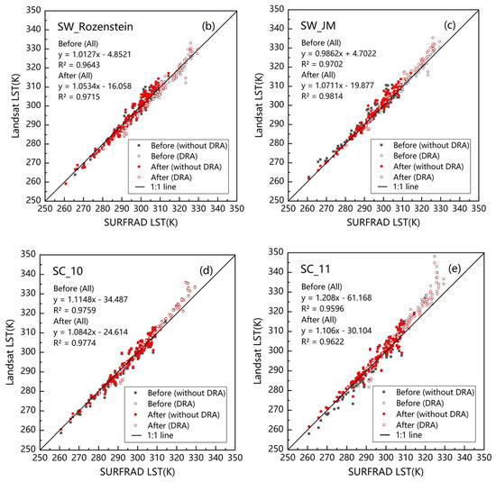 Comparison of retrieved LST before and after the stray light correction for different algorithms. (a) for SW_Du, (b) for SW_Rozenstein, (c) for SW_JM, (d) for SC_10, and (e) for SC_11. The linear regression coefficients were obtained from data of all five sites. “Before/After (without DRA)” in the figure means the data from the other four SURFRAD sites after excluding DRA before or after the correction; “Before/After (DRA)” in the figure means the data from the DRA site before or after the correction.