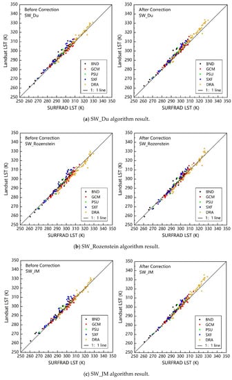 Comparison of Landsat 8 retrieved LST (Landsat LST) with ground LST (SURFRAD LST) over different sites before and after the stray light correction. (a) is for the SW_Du algorithm, (b) is for the SW_Rozenstein algorithm, (c) is for the SW_JM algorithm, (d) is for the SC_10 algorithm, and (e) is for the SC_11 algorithm.
