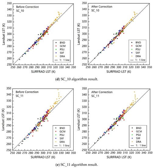 From Table 5, when excluding high ground temperature cases of DRA, there were some differences from the results including DRA in Table 4. Except the SW_Du, the RMSE of the other four algorithms all decreased little and RMSEs of five algorithms all were within 3.0 K after the correction. The decreases on RMSE of SC_10 and SC_11 were both around 0.3 K, narrowing the gap of the RMSE change on SC_10 and SC_11 in Table 4. This indicated that the correction and improvement of single-channel algorithm on Band 11 were greater than Band 10 in a high ground temperature range, which was consistent with the result in Figure 2 and Figure 4d,e. However, the RMSE change of split-window algorithms was different from Table 4, especially for SW_JM, which will be analyzed in detail in the Discussion section. Considering the high temperature cases in the practical use, this paper finally kept the DRA site in the statistical analysis to make the conclusion more universal.