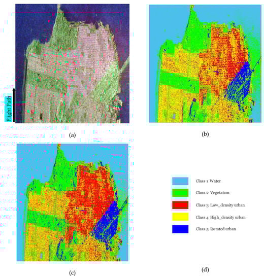 In order to compare which model is better to present the multi-look fully polarimetric SAR data, RADARSAT-2 data acquired over the San Francisco Bay area, USA, were used to evaluate the performance of the two mixture strategies. The Pauli color-coded image is shown in Figure 1a. The PolSAR image was filtered using the refined Lee filter with a 9 × 9 window.
