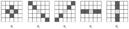 MRF takes advantage of the spatial information, so that the noise effect in the classification can be alleviated. A fixed neighborhood could result in blurred-structure details. In order to solve this problem, the adaptive neighborhood [30] is proposed to preserve the details of the image. The neighborhood system has five candidates, i.e., , as shown in Figure 2. Each shape of the five candidates is related to a different terrain situation. The most suitable candidate is selected by the following criterion,