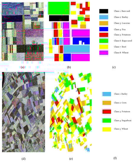 Polarimetric SAR data collected over two agricultural areas and a city were used for the experiments. The first were the L-band data from NASA/JPL AIRSAR collected over Flevoland Nederland in 1989. The Pauli color-coded figure and the ground truth map are shown in Figure 4a–c, which have 400 × 280 pixels. There was a total of 8 crop classes. The second dataset was from RADARSAT-2 acquired over Wallerfing, Germany. The beam pattern of this dataset had a fine beam of 8 m. The dataset was from an agriculture area, collected on May 28, 2014, with the incidence angle ranging from 40.2° to 41.6° on the descending pass. The size of the image was 920 × 500 pixels. This region had five classes according to the ground measure. The Pauli color-coded image and the ground truth map are shown in Figure 4d–f. The third dataset was from RADARSAT-2 acquired over Fujian Province, China. The dataset was from Fuzhou Langqi Island (center latitude: 26°03′ N, center longitude: 119°35′ W), collected on November 13, 2013. The resolution was around 8 m. The size of the image was 520 × 500 pixels. This region had 3 classes, including urban area, water, and forest. Because we did not have the ground truth map, we only provided the Pauli color-coded image in Figure 4g. All PolSAR images were filtered with the refined Lee filter with a 9*9 window before performing the classification. Our computer configuration was a Core i7 CPU clocked at 1.99 GHz, 1T hard drive, and 8G of memory.