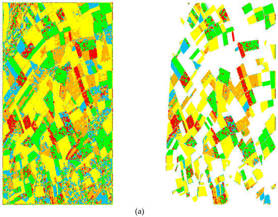 Classification results obtained by the pixel-based WMRF, KMRF, and MWMRF methods are shown in Figure 5a–c, Figure 6a–c, and Figure 7a–c. MWMRF/e denotes the MWMRF model without the edge penalty term, for which the experiment results are shown in Figure 5d, Figure 6d, and Figure 7d. The overall accuracy (OA) and the Kappa coefficients are given in Table 1 and Table 2, respectively, for the Flevoland and Wallerfing datasets.