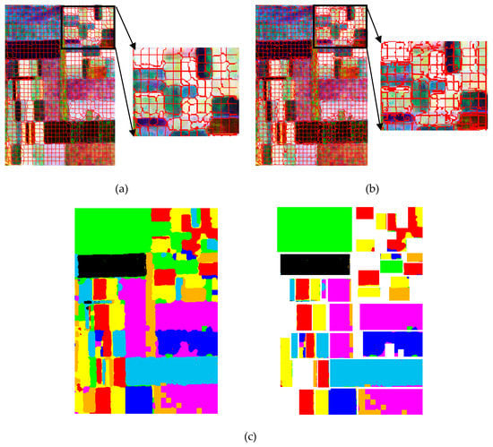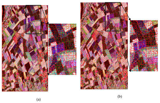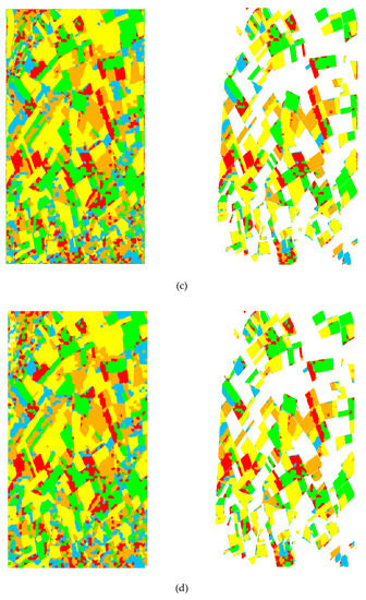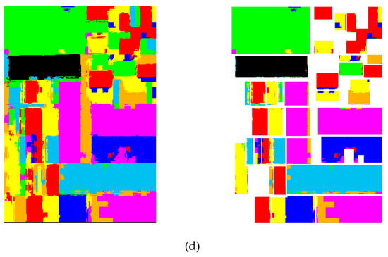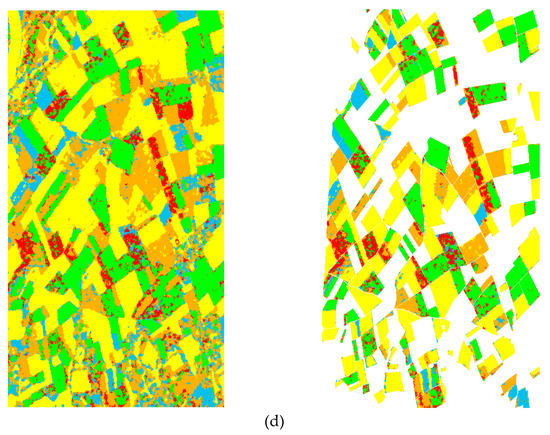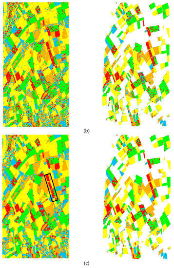 The classification results obtained by region-based methods are shown in Figure 7 and Figure 8. We set r = 10 and p = 25 in this study. The image was firstly divided into many 10 × 10 rectangles, and then, MRF models were used to adjust the boundaries. We assumed the area of a region to be no less than 25 pixels. The segmentation results are in Figure 8a,b, Figure 9a,b, and Figure 10a,b. The final classification maps were obtained based on the segmentation results using the Wishart-based ML algorithm, which are shown in Figure 8c,d, Figure 9c,d, and Figure 10c,d. Table 3 and Table 4 give the OA and the Kappa coefficients for the Flevoland and Wallerfing data classification results.