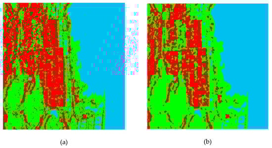 From Figure 1b,c, we can see that compared with MWW, the classification map of MWC was better by visual inspection, especially for water and urban areas. We can see from the classification results that on the right side of the image, the MWW model was affected greatly by the strong backscatter of the offshore buildings, resulting in misclassification. According to the exiting literature, we divided urban areas into three classes, which were low density urban, high density urban, and rotated urban. The MWC model could differentiate among the three types of urban areas better than the MWW model. The classification result of the rotated urban area based on the MWC model was relatively complete. Experiment results showed that using a mixture distribution to model a single class was more precise and could improve the land cover classification accuracy.