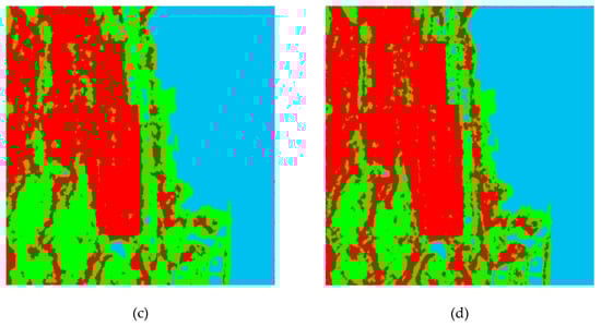 Pixel-based classification results for the Fujian data. (a) WMRF. (b) KMRF. (c) MWMRF. (d) MWMRF/e.