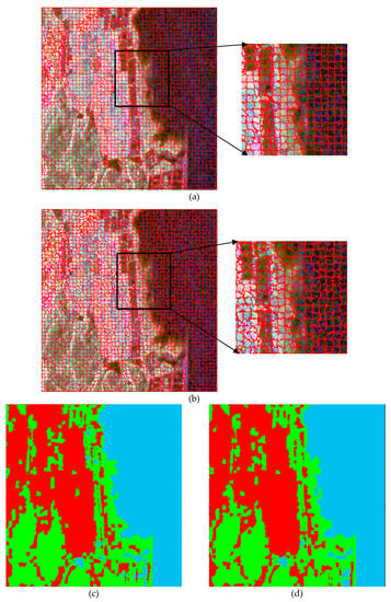 Region-based segmentation and classification results of the Fujian dataset. (a,b) Segmentation results of the whole image. (a) WMRF. (b) KMRF (c) Classification result with WMRF. (d) Classification result with KMRF.