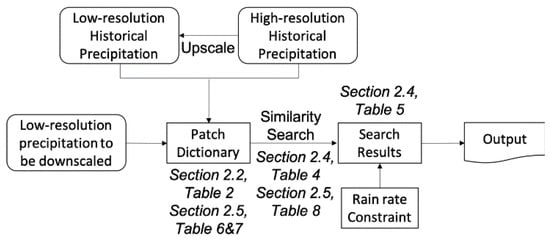 The general workflow for the proposed downscaling method is to construct a dictionary consisting of linked low and high-resolution patches using historical datasets. A similarity search is then performed on the low-resolution patch with the low-resolution GCM product as input to find the linked high-resolution patch in the dictionary. The high-resolution output will be produced by linearly aligning the corresponding high-resolution patches. In detail, the dynamic dictionary learning approach includes the following steps: