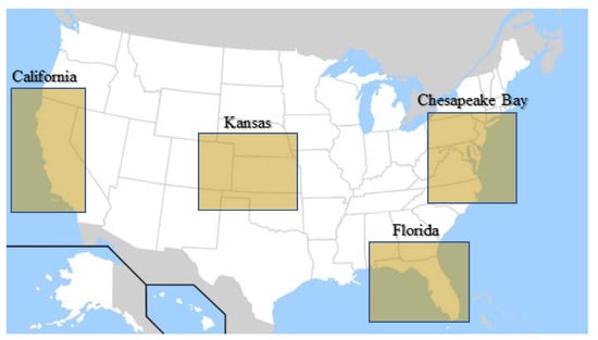The main study area is the Chesapeake Bay, which is an estuary in the Eastern U.S. Additional areas are also included for parallel comparison of the downscaling results. The specific areas are separated regions within California, Kansas, and Florida. Downscaling methods are used for all four regions, and more sets are generated for the Chesapeake Bay for long-term comparison. Figure 4 maps the geographical coverage of each study region on the U.S. map.
