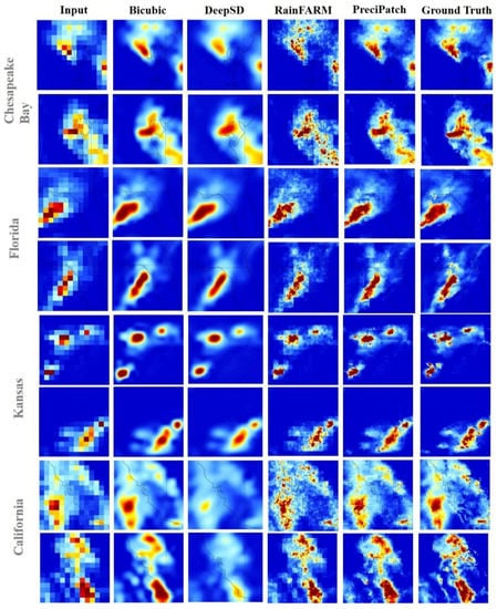 Figure 5 presents the downscaled results for different study areas. The input column in each figure contains the inputs for different downscaling methods and is used as the only input in downscale methods. The results from bicubic, DeepSD, RainFARM, and PreciPatch are in the next four columns, respectively. All the images from the same row share the same color scale. Original IMERG data are in the last column for visual comparison with different results. Generally, PreciPatch outperformed RainFARM, DeepSD, and bicubic, showing results closer to the ground truth in most cases. RainFARM method is a valid solution that meets downscaling requirements and can produce downscaling results with fast speed. However, due to the theoretical limitations of this method, which assumes rainfall fields as Gaussian random fields at all scale levels [], the practical shapes and textures of rainfall are not sufficiently simulated by RainFARM. Bicubic is often treated as the baseline for downscaling, and the results from DeepSD are very close to those from bicubic. DeepSD is showing great potential for improvements.