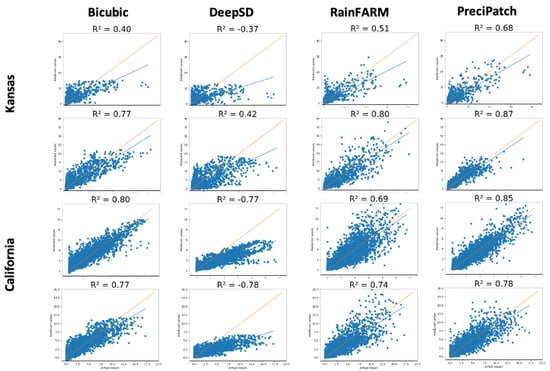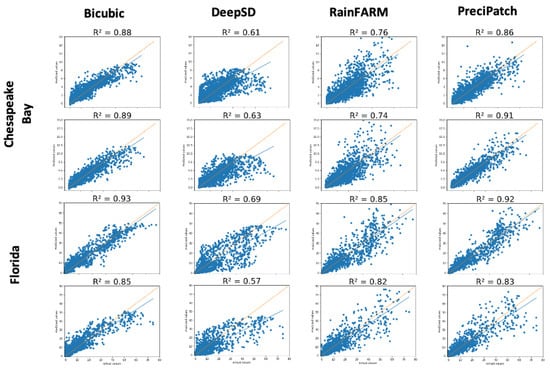 Figure 6 and Figure 7 show the direct comparison between the downscaled point values (predicted values) to the ground truth in the cases corresponding to the ones showing in Figure 5. Each plot represents a time slice. Statistically speaking, for R², bicubic and PreciPatch performs better than DeepSD and RainFARM in most cases. Six more criteria are used to evaluate the performance between different methods. A total of 2208 time slices (hourly precipitation from 2018 June, July, and August) are used from all four study regions to generate results. The statistical comparison is made through a grid-to-grid comparison between the predicted values from each method to the ground truth at each time slice. The detailed statistical comparison is shown in Table 9; the values are averaged from all time slices, where PreciPatch shows the best statistical accuracies in almost all aspects, followed by RainFARM and bicubic. DeepSD has comparatively low performance in this case study, which agrees with the results from the pre-test and visual comparison. PreciPatch outperforms RainFARM, bicubic, and DeepSD in this synthetic experiment regarding statistical accuracy.