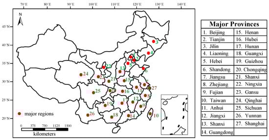 The high-resolution remote sensing images used in our research was obtained from Google earth satellite imagery (without any watermarks). It had a 0.60-m spatial resolution and was captured on 3 October 2019. These images were collected from different cities and regions in China, which covered more than 25 provinces, included nearly 300 independent and single functional regions. As is shown in Table 1, the urban land use and planning standards of development land (GB50137-2011) [] mentioned in Section 2.1 clearly define the sub-functional regions of the six urban region functions. Therefore, the remote sensing images that meet these standards were extracted according to the corresponding categories. In addition, the height and the reflectivity of the objects in remote sensing images are not concerned in this study, so the Digital Surface Model (DSM) was not used for orthorectification. In addition, there were few images that got excessive changes in appearances for the extreme slanting buildings or the effect of the atmosphere. In this case, these images have been abandoned to ensure the rationality of the data. To facilitate the processing of deep neural network, all the images were segmented into pixels, totaling approximately 16,000 images in all. Some examples are shown in Figure 1 and the map and list of the major regions where remote sensing images were extracted are shown in Figure 2.