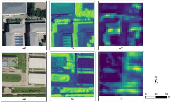 Feature maps in different resolution. (a,d) The original remote sensing images. (b,e) The high-resolution feature maps that contain the outlines and corner points information of images. (c,f) The low-resolution feature maps that contain the semantic information of images.