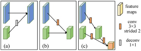In recent years, deep neural network has shown excellent performance in the task of remote sensing image classification and segmentation [,,,]. Feature maps output from different layers in neural network reflect different characteristics of remote sensing images. Specifically, the high-resolution feature maps output from the shallow layers contain rich outlines and corner points information, and the examples are shown in Figure 4b,e. These feature maps contain abundant detailed information, but lack of the more abstract information []. The low-resolution feature maps output from the deep layers contain semantic information, and the examples are shown in Figure 4c,f. These features are abstract and contain a more essential description of images, but the useful detailed information would be lost [,]. To make full use of the detailed information in high-resolution feature maps and the semantic information in low-resolution feature maps, a multi-resolution feature fusion model is proposed which is inspired by the research of Ke Sun in pose estimation []. The detailed architecture of the network shows in Figure 5a.