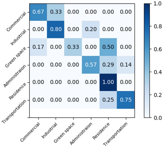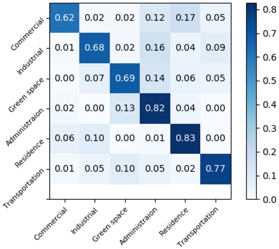 Figure 10 is the normalized confusion matrix of identifying results based on single remote sensing images. It indicates that the method in our study can achieve high accuracy on image recognition for most of the urban functional regions. However, for some categories, such as commercial and business facility, the accuracy of this urban functional region is 62%, because some of the images in this category are too similar to those in other categories, which causes confusion and disturbance on the recognition process.