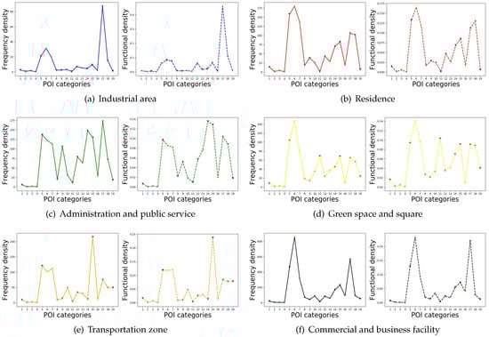 The POI categories distribution in terms of Frequency density (bold line) and Functional density (dash line) for various urban functional regions.